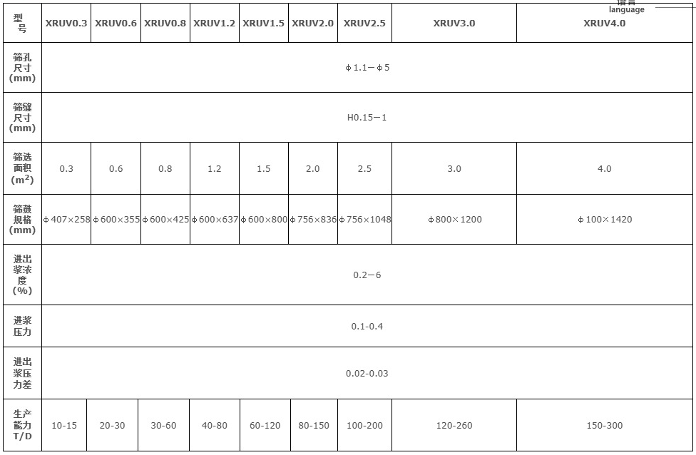 3. Advantages of the Equipment: 1. The precision screen drum, with a width of 0.15mm, is installed after the coarse screen, effectively removing fine impurities in the pulp and ink particles larger than 200um. Notably, the removal rate of adhesive substances in the pulp can reach over 90%, making this technology the most praised substitute for various thermal dispersion equipment in the industry (for a comparative study of the seam screen selection method and the thermal dispersion method regarding adhesive issues, refer to Professor Chen Jiaxiang's article in the third issue of "Paper and Pulp" published in 2000, detailing the application of seam screens as a replacement for dispersers in waste paper systems). 2. Heavy impurities are discharged into a heavy impurity tank at the bottom of the screen body, preventing wear and damage to the rotor and screen drum, thereby reducing downtime. 3. Light impurities and air are rapidly discharged from the top tail pulp outlet. 4. High screening efficiency with a short retention time for impurities in the screening area significantly reduces the possibility of impurity recirculation. 5. Low required pulp feeding pressure. 4. Parameter Selection